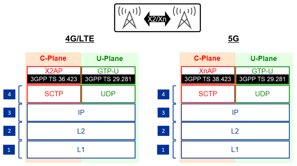 ・レイヤ4以上 :SCTP & X2AP/XnAP (C-Plane)、UDP & GTP-U (U-Plane)